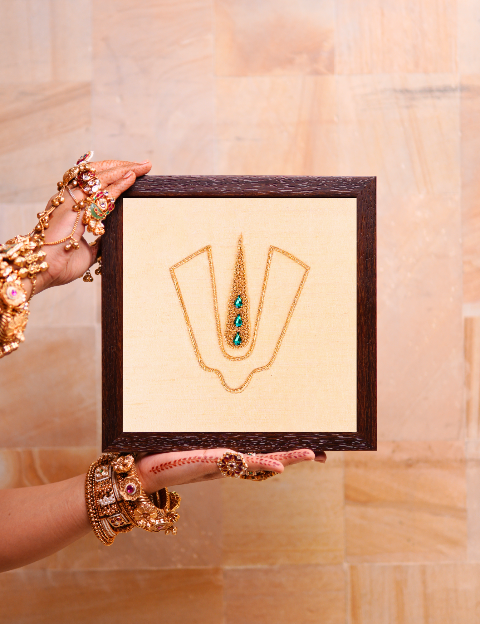 This handcrafted Vighnaharta wall art represents divine protection, inner strength, and spiritual assurance. Invoking Lord Ganesha in His powerful form as Vighnaharta — the remover of obstacles — this artwork is created to support clarity, confidence, and smooth beginnings. Meticulously hand-embroidered using 24-carat gold-plated zari on pure handloom silk, the artwork reflects India’s sacred craftsmanship while blending seamlessly with refined contemporary interiors. Created by skilled Indian artisans, this luxury spiritual wall art transforms walls into spaces of stability, positivity, and divine guidance — ideal for homes, offices, workspaces, and meditation areas.